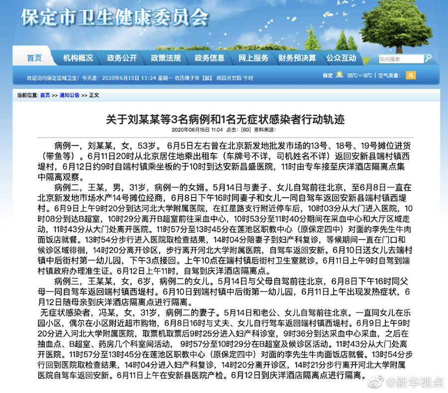 無癥狀感染者,馮某,女,31歲,病例二的妻子。5月14日和老公、女兒自駕前往北京。一直同女兒在樂園小區(qū),偶爾在小區(qū)附近超市購物,6月8日16時與丈夫、女兒自行駕車返回端村鎮(zhèn)西堤村。6月9日上午9時20分進(jìn)入河北大學(xué)附屬醫(yī)院,取票機(jī)取票后9時25分進(jìn)入婦產(chǎn)科診室,9時36分到達(dá)采血中心采血,之后在抽血點、B超室、藥房幾個科室間活動, 9時57分至10時29分在B超室及候診區(qū)活動。11時43分從大門處離開醫(yī)院。11時57分至13時45分在保定市四職中對面的李先生牛肉面飯店就餐。13時54分步行回到醫(yī)院取檢查結(jié)果,14時04分進(jìn)入婦產(chǎn)科復(fù)診,14時20分離開診區(qū),14時21分步行離開河北大學(xué)附屬醫(yī)院自駕車返回安新。6月11日上午在安新縣醫(yī)院產(chǎn)檢。6月12日到慶洋酒店隔離點進(jìn)行隔離。(記者秦婧、李繼偉)