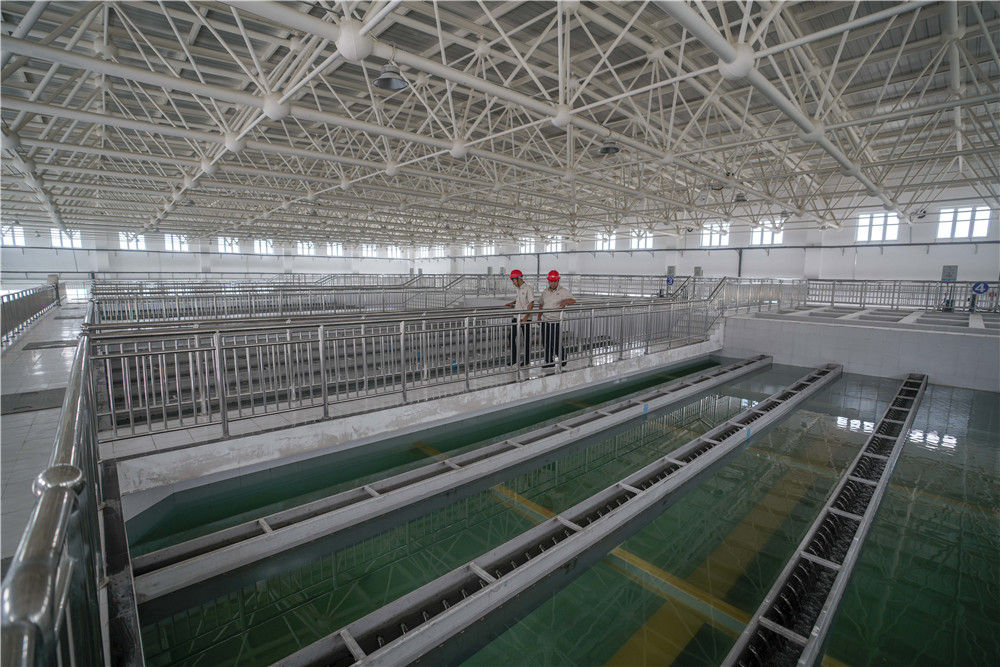 在新疆喀什地區(qū)城鄉(xiāng)供水總水廠里,工作人員檢查清水池工作情況(6月8日攝)。這些安全水將通過近112公里的主管道直達(dá)伽師縣,供應(yīng)當(dāng)?shù)鼐用裼盟?/span>新華社記者 趙戈 攝