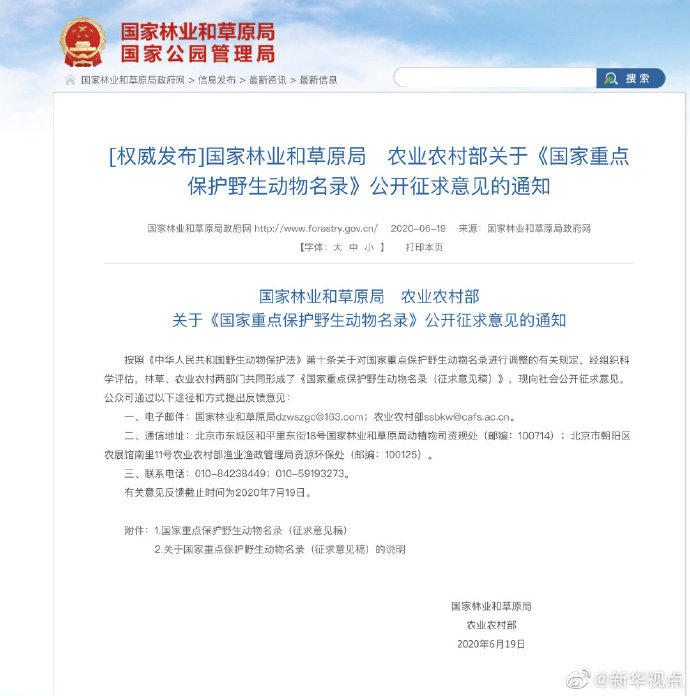 這些調(diào)整你同意嗎?公眾可通過以下途徑和方式提出反饋意見:一、電子郵件:國家林業(yè)和草原局dzwszgc@163.com;農(nóng)業(yè)農(nóng)村部ssbkw@cafs.ac.cn。二、通信地址:北京市東城區(qū)和平里東街18號國家林業(yè)和草原局動植物司資規(guī)處(郵編:100714);北京市朝陽區(qū)農(nóng)展館南里11號農(nóng)業(yè)農(nóng)村部漁業(yè)漁政管理局資源環(huán)保處(郵編:100125)。三、聯(lián)系電話:010-84238449;010-59193273。有關(guān)意見反饋截止時間為2020年7月19日。(記者胡璐)