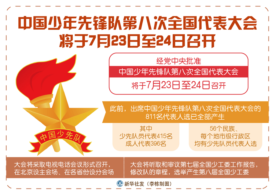 新華社北京7月20日電(記者王鵬)經黨中央批準,中國少年先鋒隊第八次全國代表大會將于7月23日至24日召開。目前,大會的各項籌備工作進展順利。