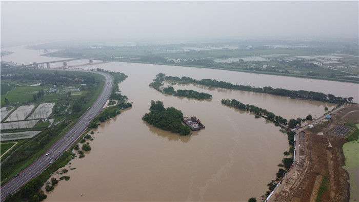 流經(jīng)安徽肥西縣三河鎮(zhèn)的河流水位猛漲(7月19日攝,無人機(jī)照片)。新華社記者 陳諾 攝