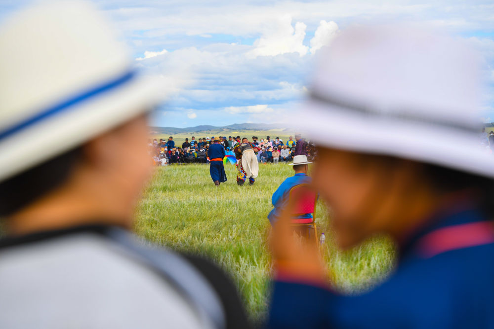 8月3日,錫林花(右)與小伙伴觀看那達(dá)慕中的搏克比賽。