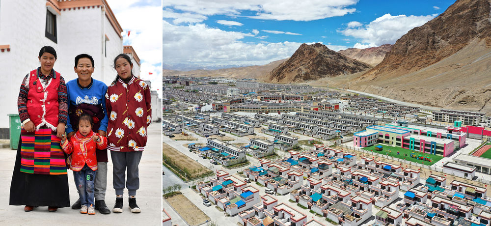 拼版照片:左圖為西藏阿里地區(qū)日土縣東汝鄉(xiāng)阿汝村村民丹木真一家在噶爾縣康樂新居易地扶貧搬遷安置點;右圖為該搬遷安置點一角(無人機照片)。新華社記者 詹彥 攝