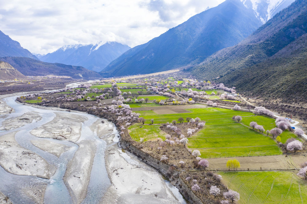 西藏林芝市波密縣境內(nèi)桃花盛開的田園風(fēng)光(3月26日攝,無人機照片)。新華社記者 普布扎西 攝
