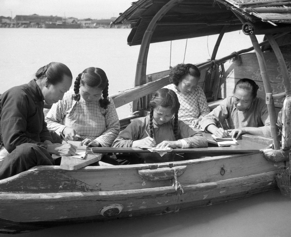 ↑ 1958年,福建省福州市生活在水上的婦女在船頭練習(xí)寫字。解放前,福州市的水上居民中婦女100%都是文盲。解放后,她們走進(jìn)了識(shí)字班,在當(dāng)?shù)匦W(xué)教師的輔導(dǎo)下開(kāi)展掃盲學(xué)習(xí)。