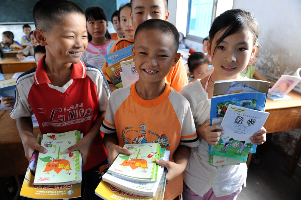 ↑ 這是2008年9月1日,江西樟樹(shù)市第二小學(xué)五(1)班鄧文?。ㄖ校┑韧瑢W(xué)領(lǐng)到免費(fèi)教科書。