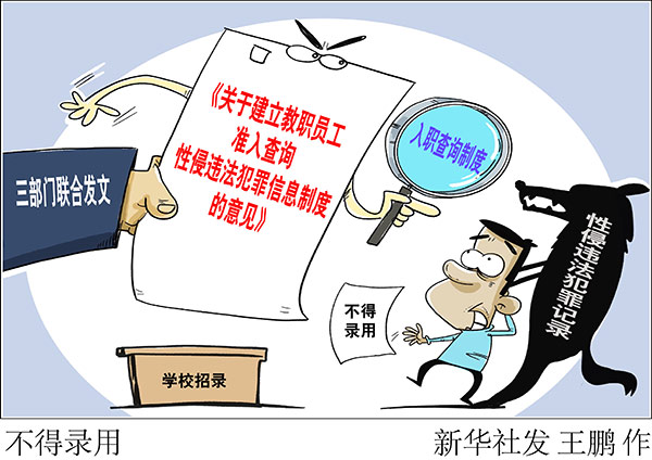 新華社北京9月18日電(記者陳菲)為加強(qiáng)對性侵未成年人犯罪的源頭預(yù)防,最高檢、教育部、公安部近期聯(lián)合發(fā)文,要求在全國建立入職查詢制度,對具有性侵違法犯罪記錄的人員,中小學(xué)校、幼兒園不得錄用,教師認(rèn)定機(jī)構(gòu)不得認(rèn)定教師資格。