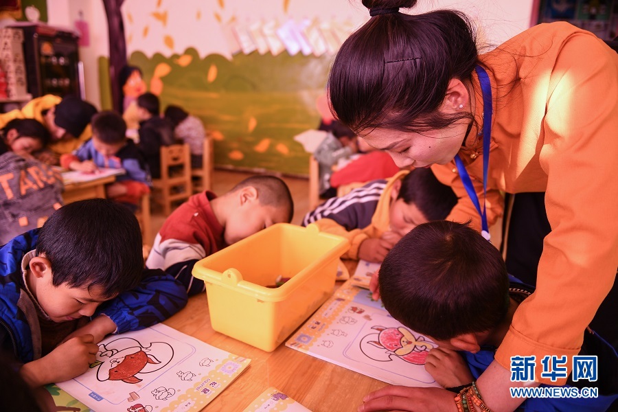 9月17日,青海省果洛藏族自治州瑪沁縣拉加鎮(zhèn)中心幼兒園的老師輔導(dǎo)孩子們上美術(shù)課。(新華網(wǎng)潘彬彬 攝)