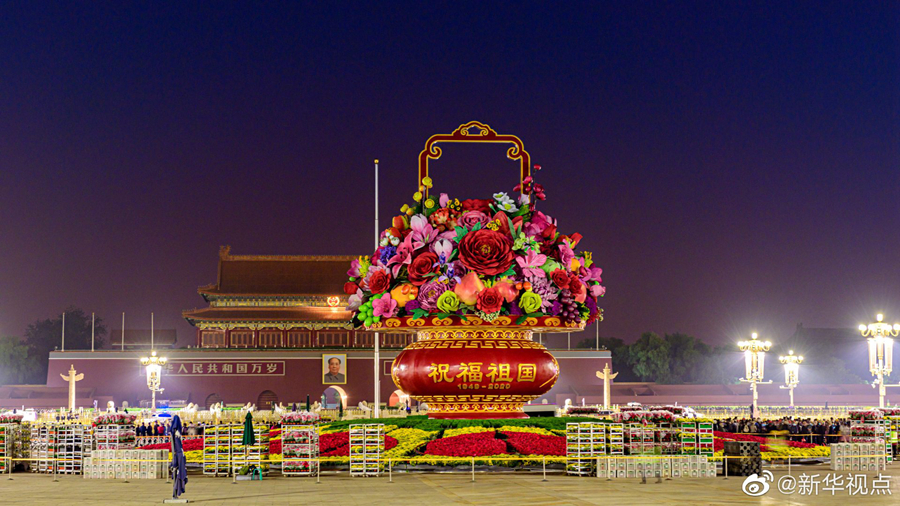 據(jù)悉,大花籃以喜慶的花果籃為主景,花籃為鋼架結(jié)構(gòu),籃身為玻璃鋼材質(zhì),籃盤直徑12米,花壇底部直徑45米。在籃體南側(cè)書寫“祝福祖國,1949-2020”字樣,在籃體北側(cè)書寫 “萬眾一心,1949-2020”字樣?;@內(nèi)共使用了125枝大型仿真花,籃底部花壇則使用我國自育花園小菊“絢秋星光”與一品紅組成10顆紅心的圖案。
