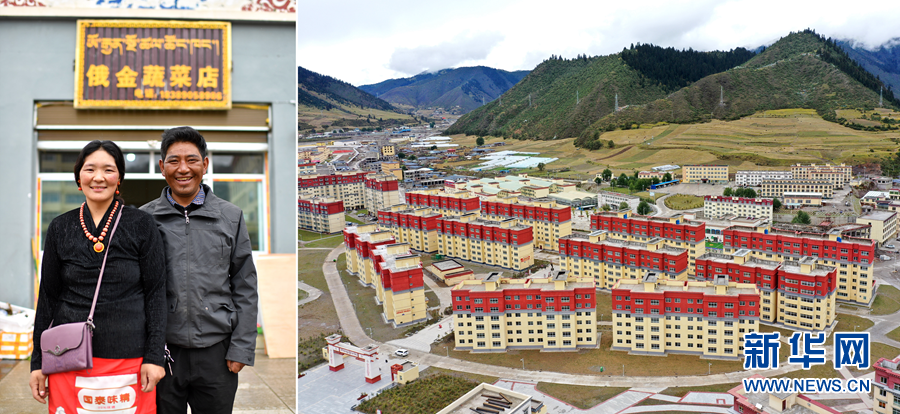 2020年9月22日拍攝的拼版照片:左圖為西藏自治區(qū)昌都市類(lèi)烏齊縣長(zhǎng)毛嶺鄉(xiāng)達(dá)雄村村民俄金(右)和妻子阿丁在安置點(diǎn)俄金蔬菜店前;右圖為類(lèi)烏齊縣桑多扶貧開(kāi)發(fā)區(qū)易地扶貧搬遷安置點(diǎn)一角(無(wú)人機(jī)照片)。 新華社記者 詹彥 攝
