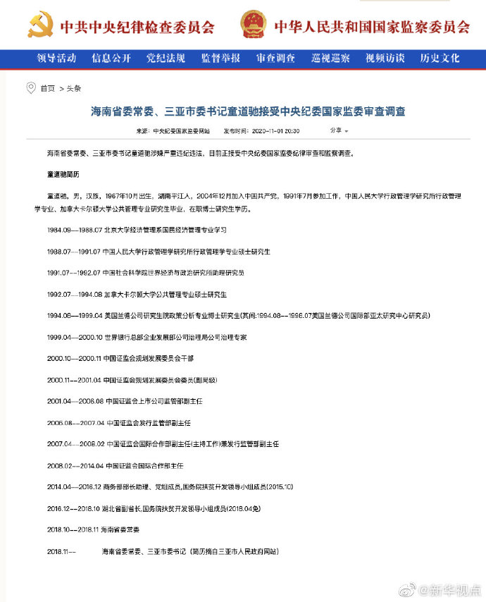 海南省委常委、三亞市委書記童道馳涉嫌嚴(yán)重違紀(jì)違法,目前正接受中央紀(jì)委國家監(jiān)委紀(jì)律審查和監(jiān)察調(diào)查。