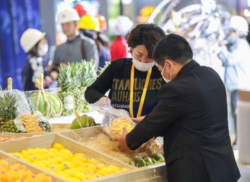11月2日,在食品及農(nóng)產(chǎn)品展區(qū),一企業(yè)展臺(tái)的工作人員在擺放展品。連日來,第三屆中國(guó)國(guó)際進(jìn)口博覽會(huì)舉辦地國(guó)家會(huì)展中心(上海)內(nèi)一派忙碌景象,各個(gè)展館的搭建和布置工作正有條不紊地進(jìn)行。新華社記者 丁汀 攝