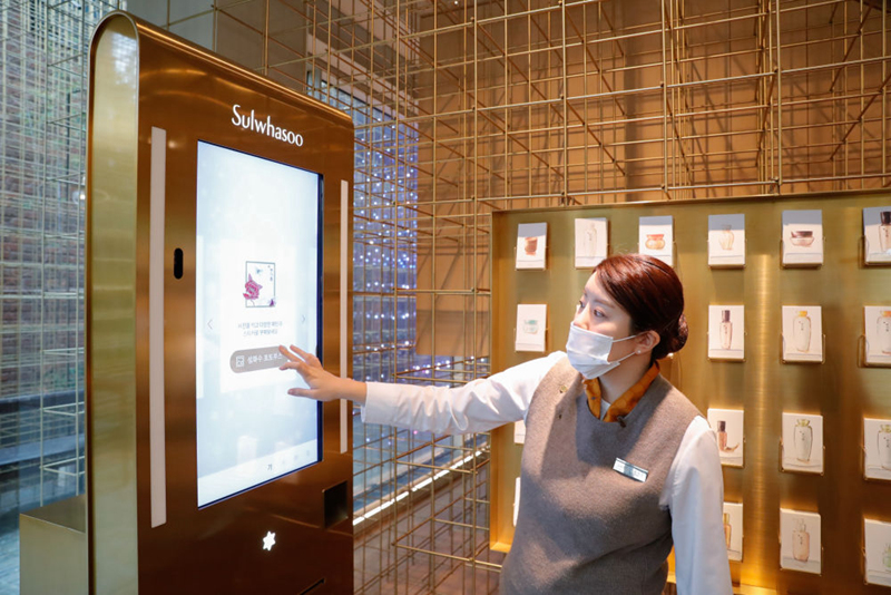 10月27日,工作人員在位于韓國(guó)首爾江南區(qū)的愛茉莉太平洋雪花秀旗艦店內(nèi)指導(dǎo)客人體驗(yàn)店內(nèi)設(shè)施??偛课挥陧n國(guó)首爾的美妝企業(yè)愛茉莉太平洋集團(tuán)今年將連續(xù)第三次參加進(jìn)博會(huì)。新華社記者 王婧嬙 攝
