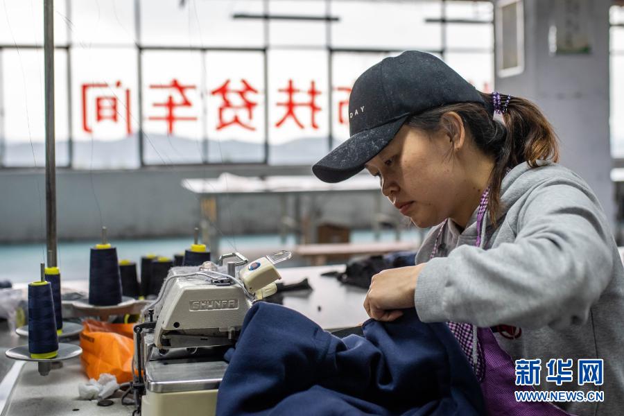 9月24日,搬遷戶龍先燕在鎮(zhèn)雄縣大地易地扶貧搬遷安置點(diǎn)銳烽服飾扶貧車間工作。新華社記者 胡超 攝