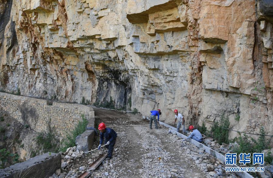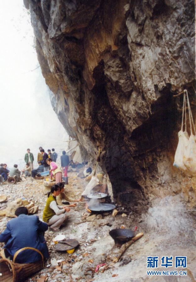 修路遠(yuǎn)比想象的難。四周陡峭巖壁,很難找到落腳之地,膽子大的腰系長(zhǎng)繩站在籮筐里,吊在幾百米高的懸崖邊鉆炮眼,先炸出一小塊立足之地,再用鋤頭、鋼釬和大錘,一塊一塊把石頭鑿下來(lái)。