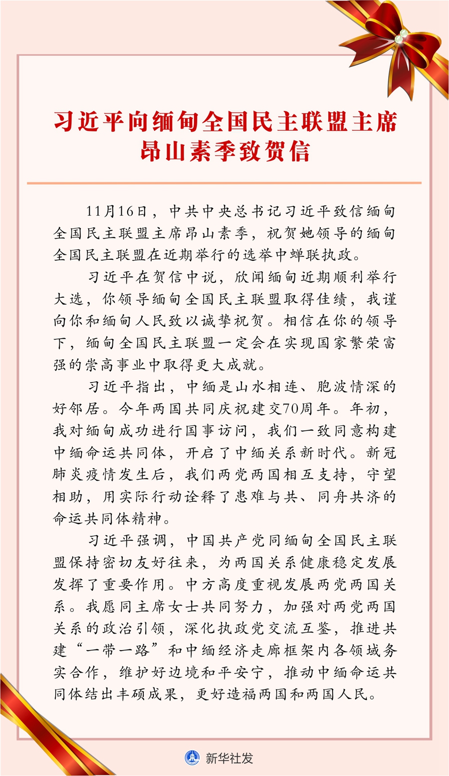 習(xí)近平在賀信中說,欣聞緬甸近期順利舉行大選,你領(lǐng)導(dǎo)緬甸全國民主聯(lián)盟取得佳績,我謹(jǐn)向你和緬甸人民致以誠摯祝賀。相信在你的領(lǐng)導(dǎo)下,緬甸全國民主聯(lián)盟一定會在實(shí)現(xiàn)國家繁榮富強(qiáng)的崇高事業(yè)中取得更大成就。