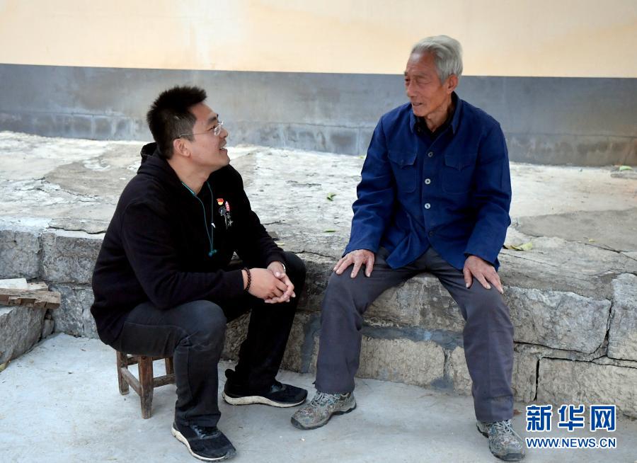 田昕(左)與牛橫嶺村村民牛天保交流(10月12日攝)。新華社記者 李嘉南 攝