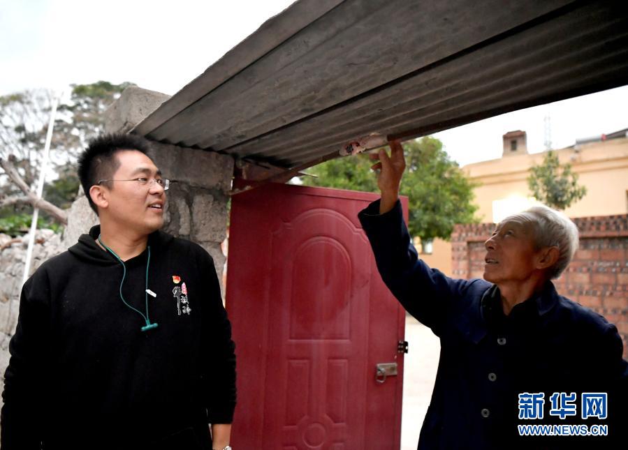 牛橫嶺村村民牛天保(右)將自家門(mén)梁掰成拱形并用布條包住,以防田昕進(jìn)門(mén)時(shí)碰到頭(10月12日攝)。新華社記者 李嘉南 攝
