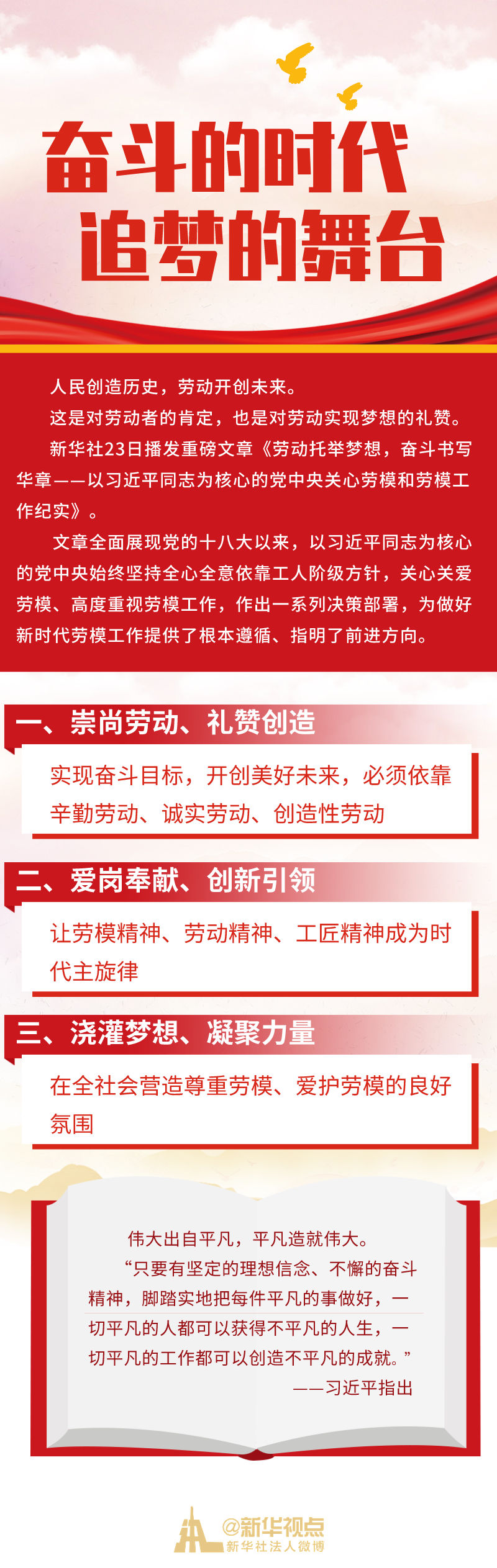 新華社23日播發(fā)重磅文章《勞動托舉夢想,奮斗書寫華章——以習(xí)近平同志為核心的黨中央關(guān)心勞模和勞模工作紀(jì)實(shí)》。