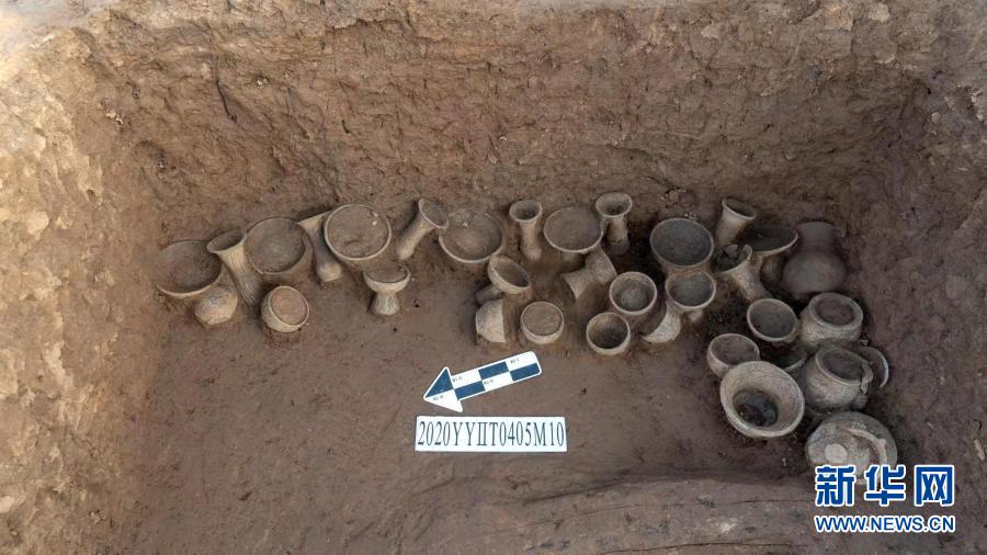 圖為河南葉縣余莊遺址標(biāo)號為T0405的探方出土的陶器,該組陶器擺放有序,呈現(xiàn)出鮮明的禮制色彩(11月3日攝)。新華社發(fā)(河南省文物考古研究院供圖)