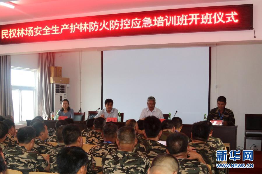 石立忠(臺(tái)上左二)和翟文杰(臺(tái)上右一)在民權(quán)林場(chǎng)安全生產(chǎn)護(hù)林防火防控應(yīng)急培訓(xùn)班開(kāi)班儀式上(資料照片)。新華社發(fā)