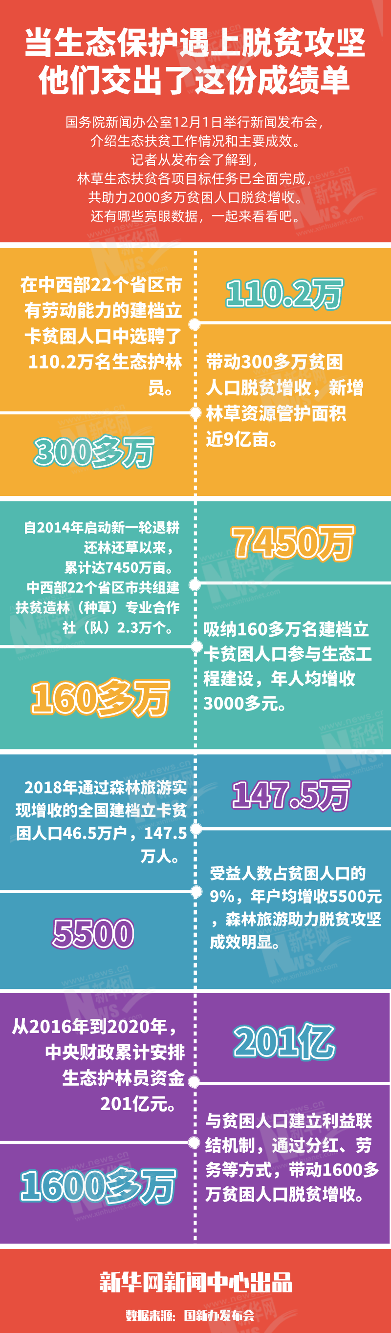 ??? 國(guó)務(wù)院新聞辦公室12月1日舉行新聞發(fā)布會(huì),介紹生態(tài)扶貧工作情況和主要成效。記者從發(fā)布會(huì)了解到,林草生態(tài)扶貧各項(xiàng)目標(biāo)任務(wù)已全面完成,共助力2000多萬(wàn)貧困人口脫貧增收。還有哪些亮眼數(shù)據(jù),一起來(lái)看看吧。