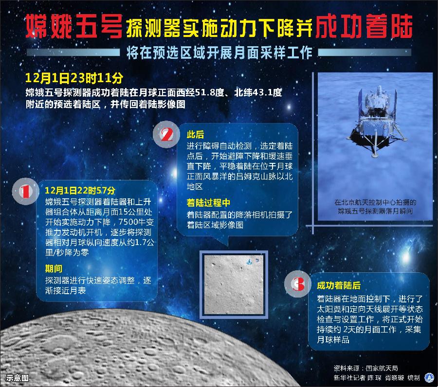 圖表:嫦娥五號探測器實(shí)施動力下降并成功著陸 將在預(yù)選區(qū)域開展月面采樣工作 新華社記者 陳琛 編制
