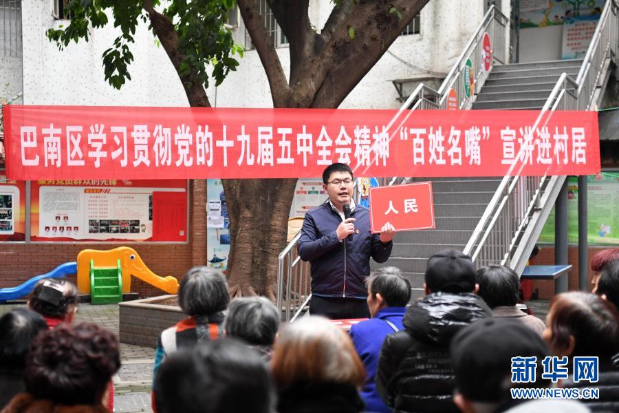 12月1日,宣講員向群眾宣講黨的十九屆五中全會精神。12月1日,重慶市巴南區(qū)魚洞街道魚新街社區(qū)舉行學習貫徹黨的十九屆五中全會精神“百姓名嘴”進村居活動。據(jù)介紹,重慶市巴南區(qū)“百姓名嘴”宣講團是由基層干部、教師、民間藝人等基層理論骨干自愿組成的理論宣講隊伍,現(xiàn)有宣講員85名。宣講團成員將理論宣講與評書、快板、三句半、木洞山歌等文藝形式相結合,目前已在巴南區(qū)開展了110余場學習貫徹黨的十九屆五中全會精神宣講活動。新華社記者 唐奕 攝