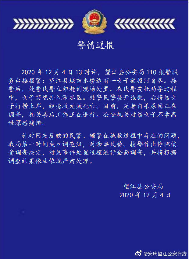 女子投河自盡,民警營救不力?涉事者被停職調(diào)查