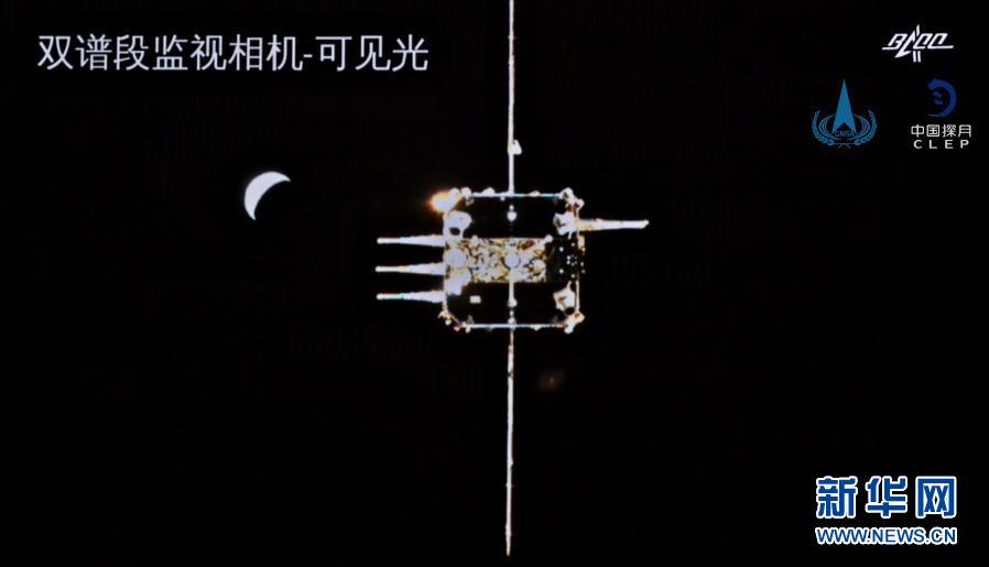 這是嫦娥五號軌道器返回器組合體逐漸接近上升器畫面。