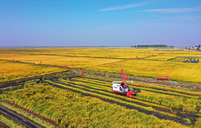9月27日,農(nóng)民操作機(jī)械在興安盟袁隆平院士工作站鹽堿地水稻基地收獲水稻 徐欽攝 / 本刊