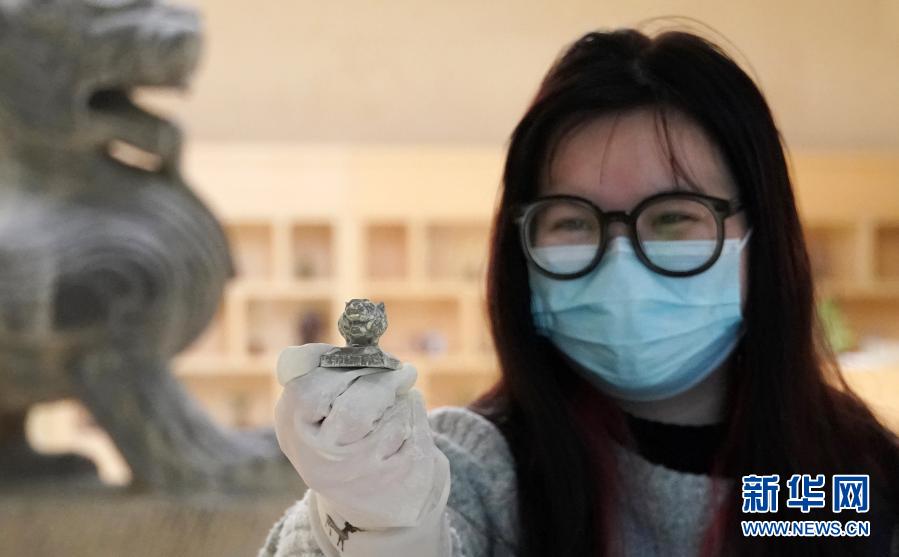 工作人員展示從“考古盲盒”中挖出的虎首印章文創(chuàng)產品(12月8日攝)。新華社記者 袁月明 攝