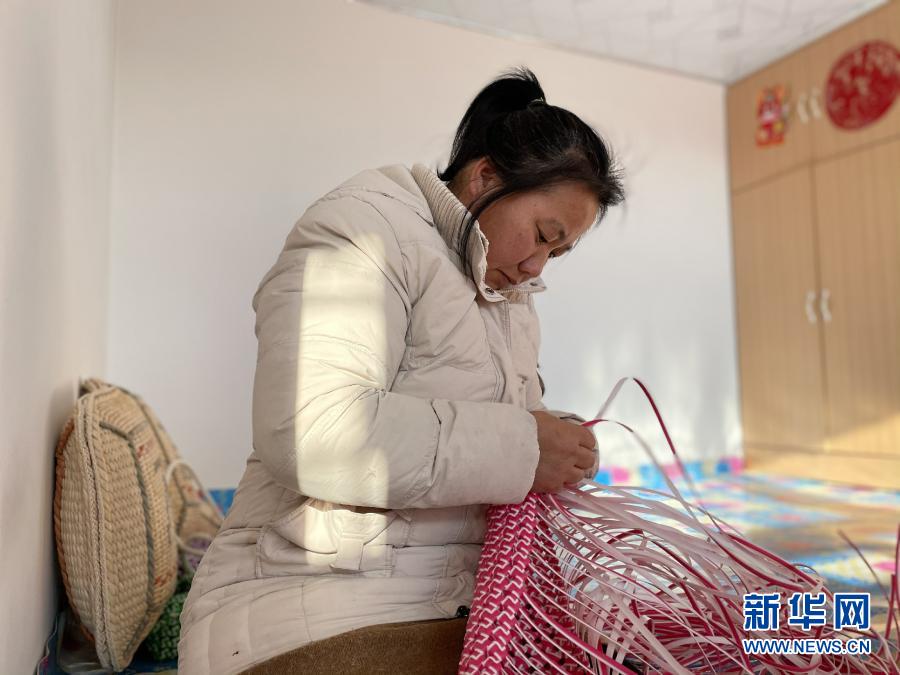 12月20日,在黑龍江省大慶市林甸縣宏偉鄉(xiāng)宏偉村,脫貧戶馬長蘭在家中編織籃子。新華社記者 楊喆 攝
