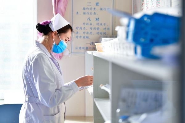 12月16日,海東市第一人民醫(yī)院內(nèi)科護士劉海婷在藥房取藥。