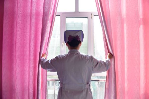 12月16日,海東市第一人民醫(yī)院內(nèi)科護士劉海婷在病房內(nèi)為患者拉開窗簾。