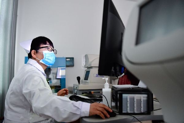 12月16日,海東市第二人民醫(yī)院眼科護士許國娟在給患者檢查視力。
