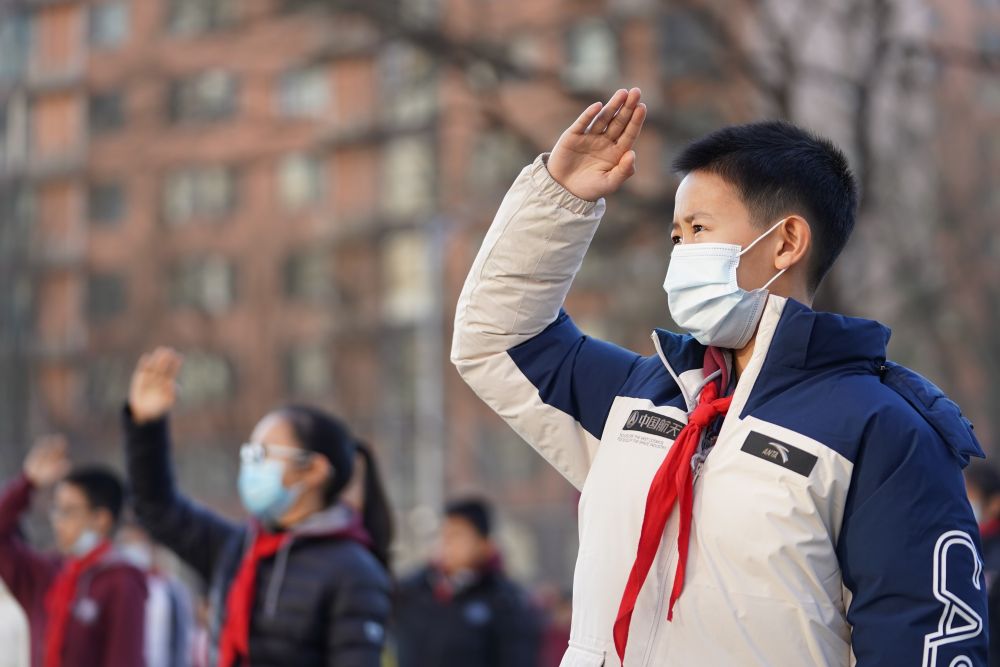 ??12月21日,在北京四中廣外校區(qū),蔡昊霖(前)和同學(xué)一起參加升旗儀式。