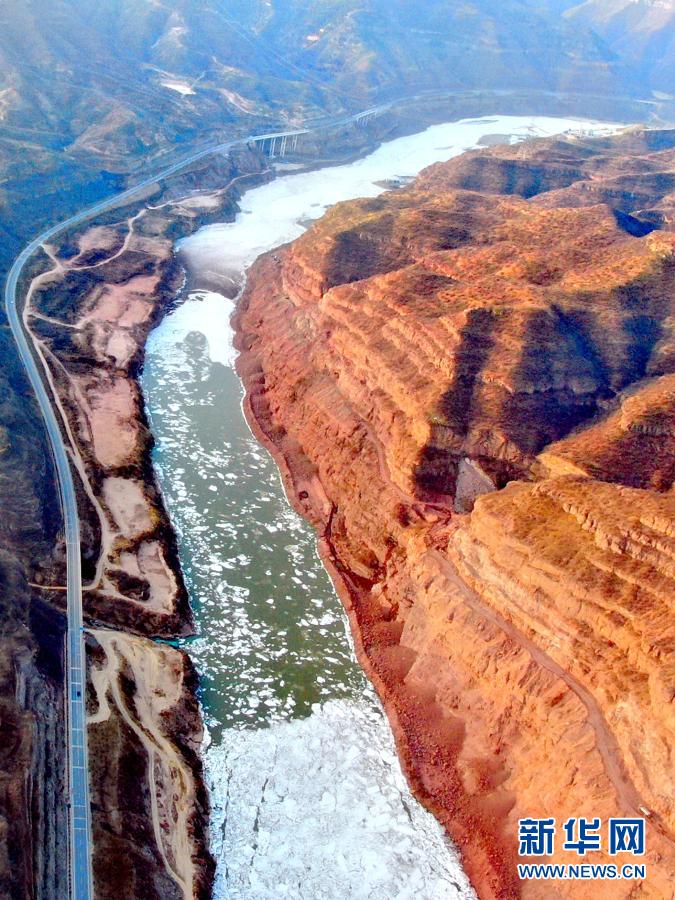 壺口瀑布至龍門水文站之間的黃河(12月26日攝,無人機(jī)照片)。新華社記者 劉詩平 攝