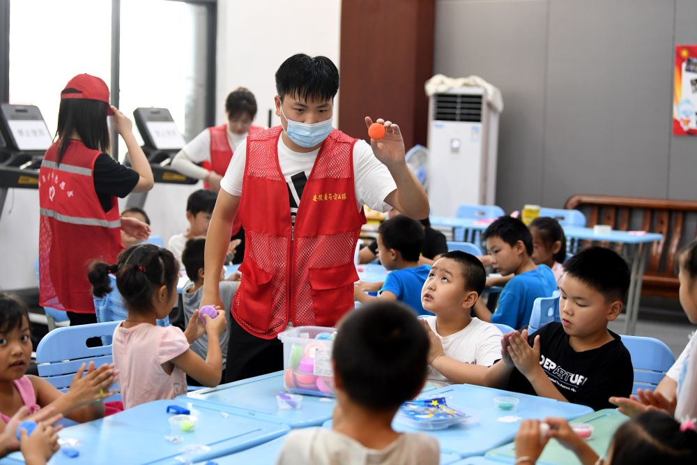 ??7月29日,在合肥市一六八中學(xué)安置點,志愿者帶小朋友做游戲。