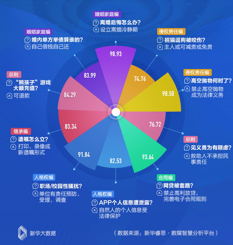 民法典草案1260個條文中,哪些最受關注?新華睿思數(shù)據(jù)顯示,最吸引人的話題為“離婚冷靜期”,網(wǎng)絡熱度值高達98.93,緊隨其后的,是與百姓日常生活緊密相關的“高空拋物”和涉及群眾“錢袋子”的“高利放貸”。