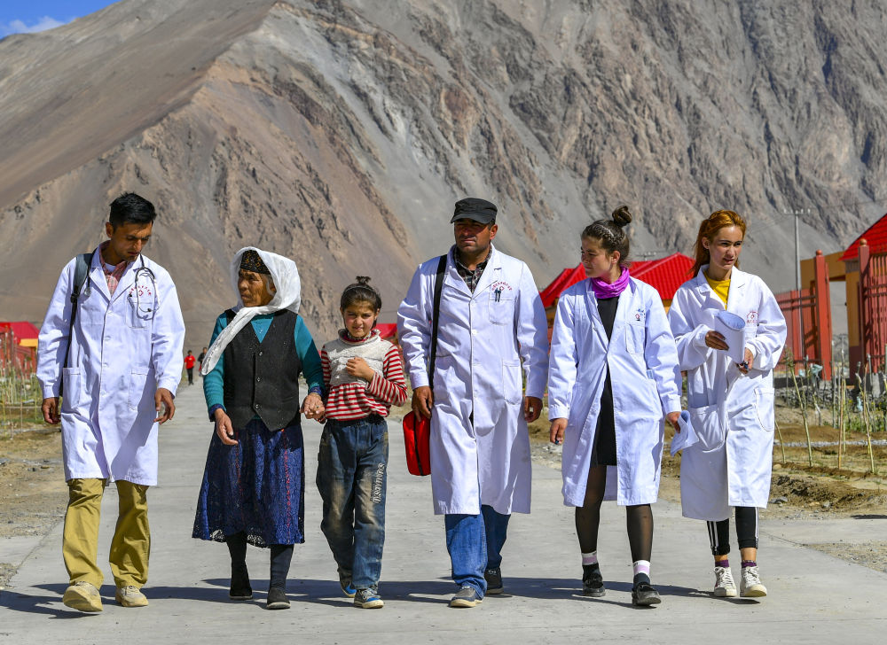 新疆塔什庫爾干塔吉克自治縣達(dá)布達(dá)爾鄉(xiāng)熱斯喀木村村醫(yī)發(fā)爾亞特·塔西白克(右三)與醫(yī)務(wù)人員來到當(dāng)?shù)匾椎胤鲐毎徇w安置點(diǎn)出診(2019年7月7日攝)。新華社記者 胡虎虎 攝