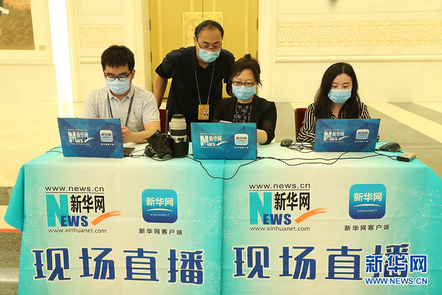2020年5月28日下午十三屆全國人大三次會議閉幕后,國務(wù)院總理李克強在人民大會堂三樓金色大廳出席記者會并回答中外記者提問。為有效防控疫情,共同維護公共衛(wèi)生與健康,記者會采用網(wǎng)絡(luò)視頻形式進行。圖為新華網(wǎng)現(xiàn)場直播團隊。 新華網(wǎng) 王翰林 攝