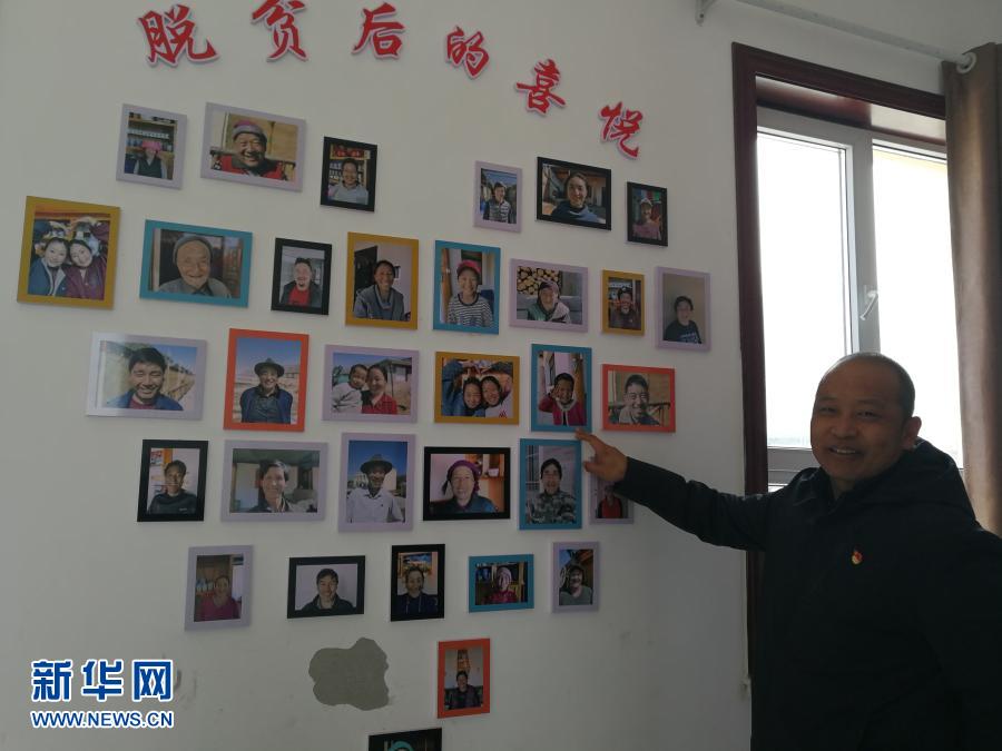青海省黃南藏族自治州尖扎縣尖扎灘鄉(xiāng)來(lái)玉村扶貧第一書(shū)記李玉棟向記者介紹來(lái)玉村“脫貧后的喜悅”。照片墻集納了村民們脫貧后的笑臉照片(2020年12月11日攝)。新華社記者 顧玲 攝