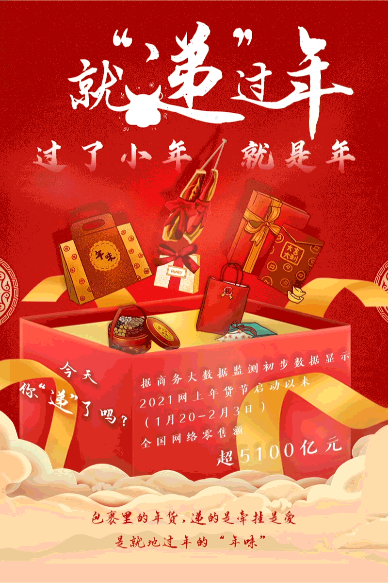 就地過年,年味不減。商務(wù)部2月4日發(fā)布數(shù)據(jù),由商務(wù)部等部門指導(dǎo)開展的“2021年全國網(wǎng)上年貨節(jié)”,自1月20日啟動以來,全國網(wǎng)絡(luò)零售額已超5100億元。“云”購年貨,就“遞”過年,成為人們的新年俗。(記者于佳欣、王雨蕭,設(shè)計(jì)張晨光)