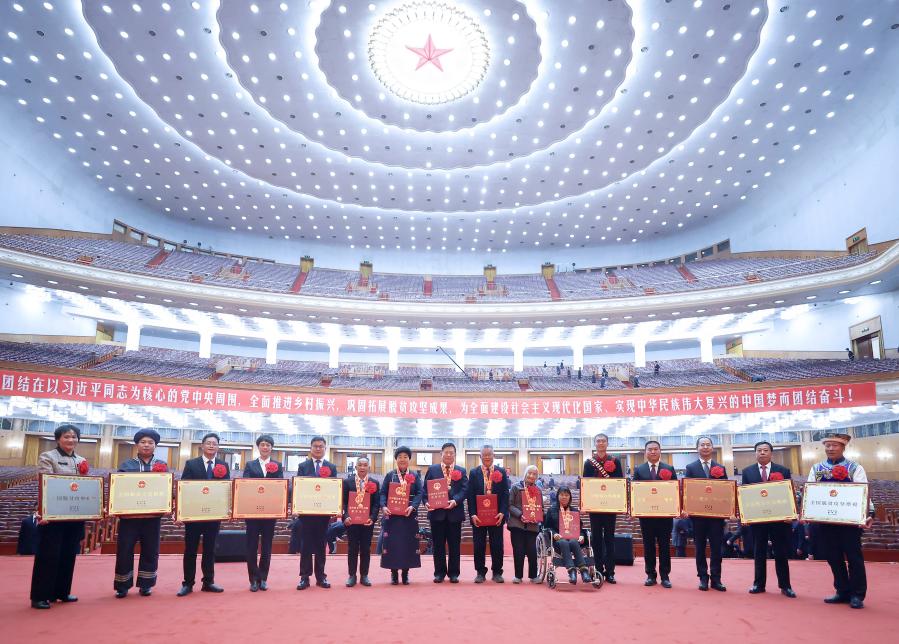 照片上,人民大會堂大禮堂標(biāo)志性的璀璨天頂,燦若星河。剛剛受到表彰的全國脫貧攻堅楷模榮譽稱號獲得者,胸戴獎?wù)?、大紅花,手捧證書、獎牌,聚攏在一起。