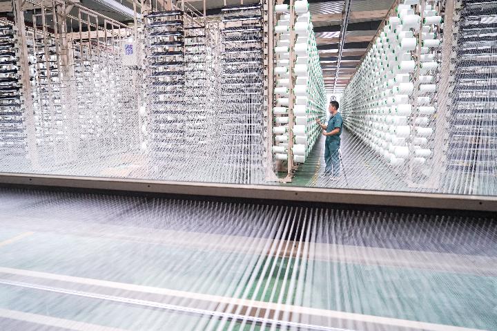 5月14日,工人在位于蘇州吳江區(qū)的一個紡織智能車間內作業(yè)。(新華社記者李博攝)