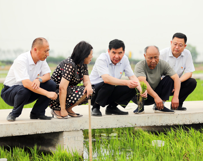 日前,劉斯杰(左三)在東營(yíng)市墾利區(qū)耐鹽堿水稻實(shí)驗(yàn)基地察看水稻長(zhǎng)勢(shì)。(墾利區(qū)委宣傳部提供)