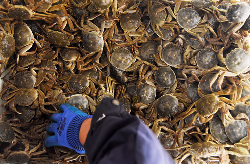 秋季,東營(yíng)黃河口大閘蟹養(yǎng)殖區(qū)工人撿拾大閘蟹的情景。新華社記者 王凱攝
