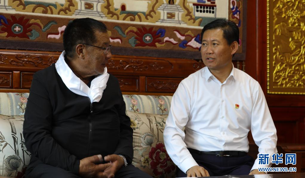 7月6日,張峰(右)與青海省海南藏族自治州共和縣恰卜恰鎮(zhèn)索吉亥村村民華旦交流。新華社記者 央秀達(dá)珍 攝