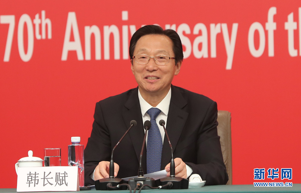 9月27日,慶祝中華人民共和國成立70周年活動新聞中心在梅地亞中心二層新聞發(fā)布廳舉辦第三場新聞發(fā)布會,中央農(nóng)村工作領(lǐng)導(dǎo)小組辦公室主任、農(nóng)業(yè)農(nóng)村部部長韓長賦,國務(wù)院扶貧開發(fā)領(lǐng)導(dǎo)小組辦公室主任劉永富介紹全面建成小康社會,扎實推進(jìn)脫貧攻堅和鄉(xiāng)村振興,并回答記者提問。圖為韓長賦介紹有關(guān)情況。新華網(wǎng) 陳杰 攝